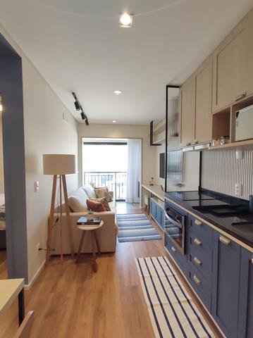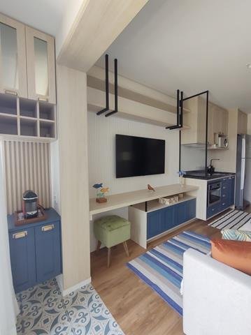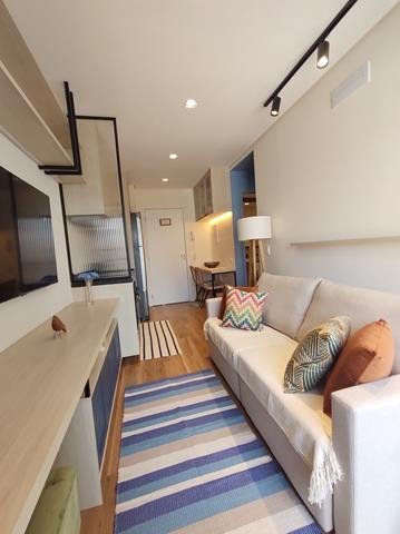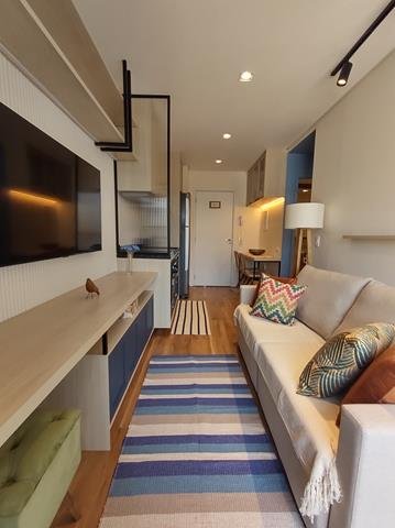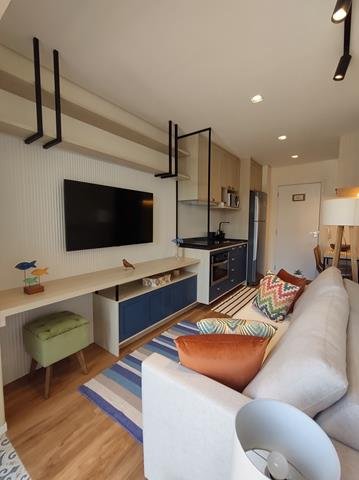 •Ambientes: Sala de estar, com varanda, integrada com a cozinha, proporcionando um ambiente aconchegante e funcional. Dormitório com TV, com varanda comunicando ligando-se à sala. Banheiro com chuveiro elétrico, box e armário. Área de café na varanda com cafeteira de cápsula.