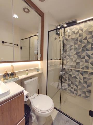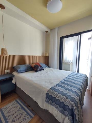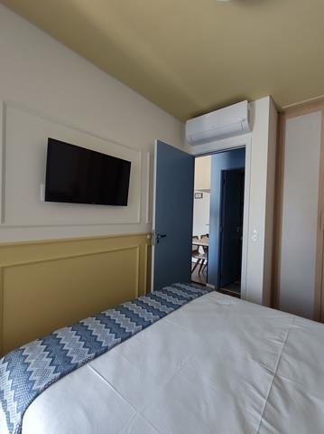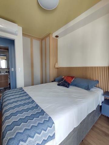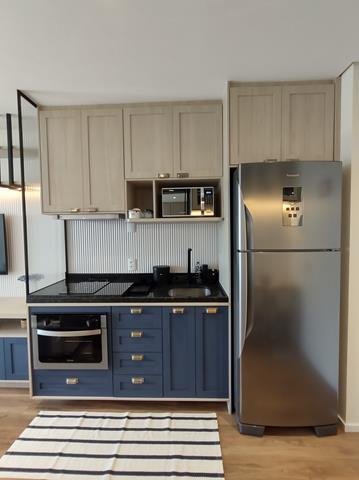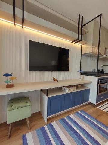 •Mobiliário: Dormitório, banheiro e cozinha com armários planejados, sala com rack e painel com TV, bancada para refeições com duas cadeiras. Cozinha equipada com geladeira, fogão de indução com duas bocas, forno elétrico e micro-ondas. Roupa de cama, mesa e banho, além de pratos, copos e taças. Ar-condicionado no quarto
