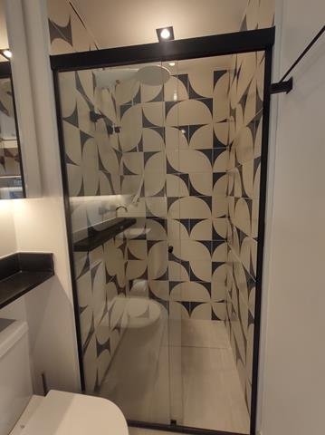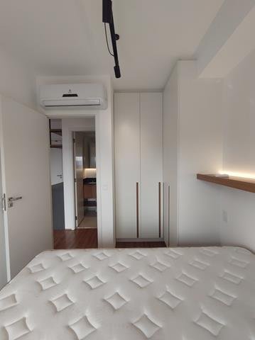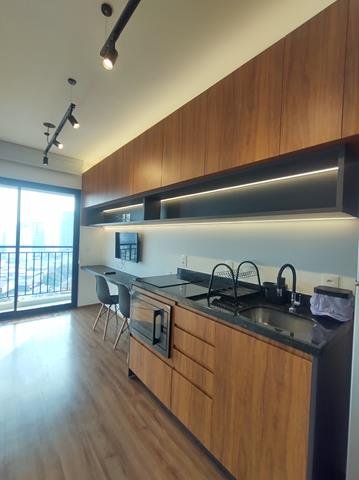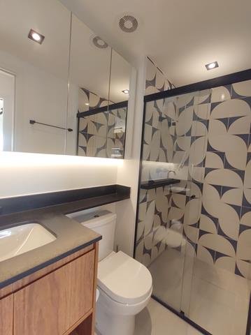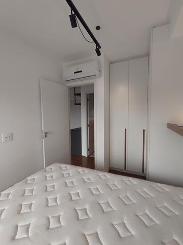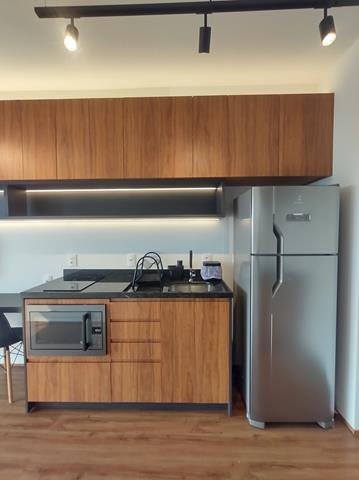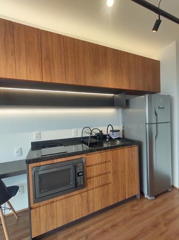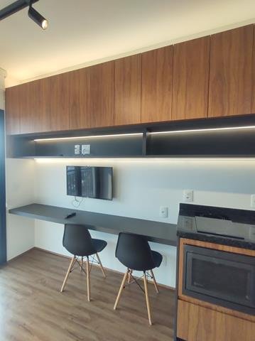 •Mobiliário: Dormitório, banheiro e cozinha com armários planejados de excelente bom gosto, sala com aparador multifunção no rack e painel para TV, bancada para refeições (embutida) com duas cadeiras. Cozinha equipada com fogão de indução com duas bocas e forno microondas. Ar-condicionado no quarto.