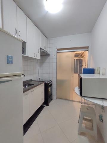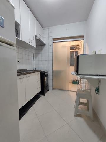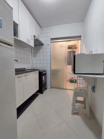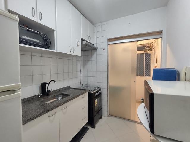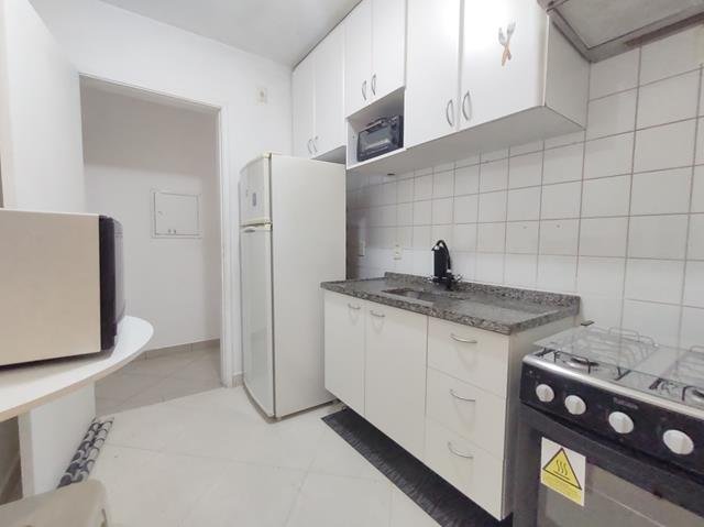 •Cozinha funcional, com armários, geladeira, fogão a gás, micro-ondas e forninho elétrico