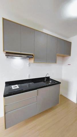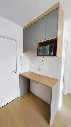 • Mobiliário: dormitório, banheiro e cozinha com armários planejados, bancada para refeições. Cozinha equipada com fogão de indução com duas bocas, depurador e forno micro-ondas.