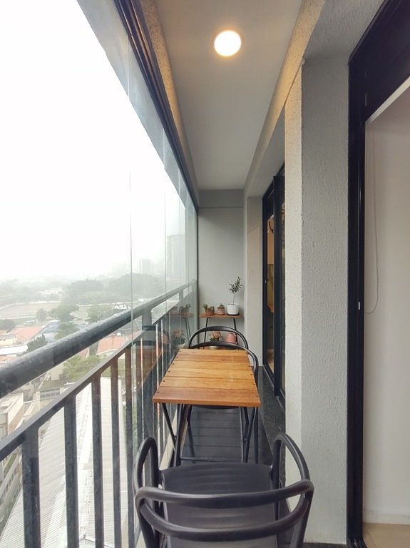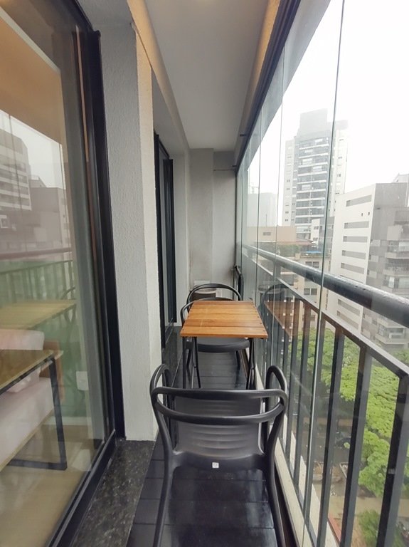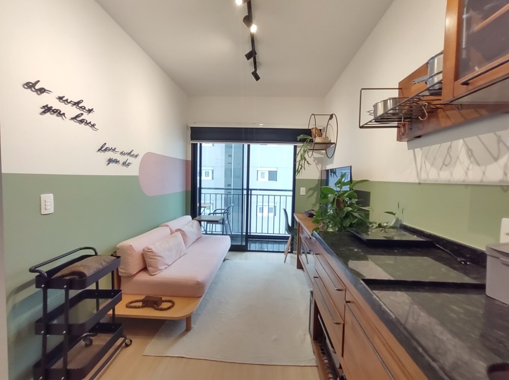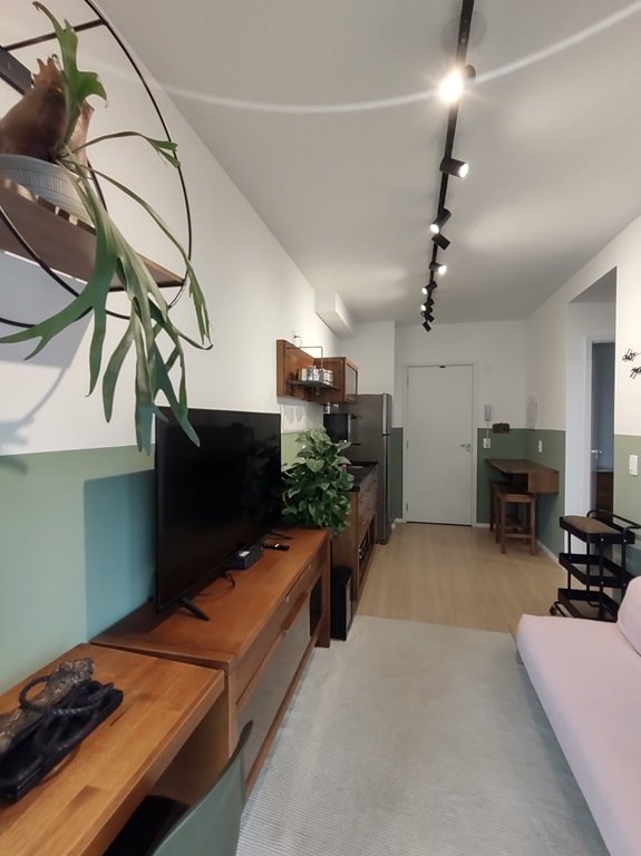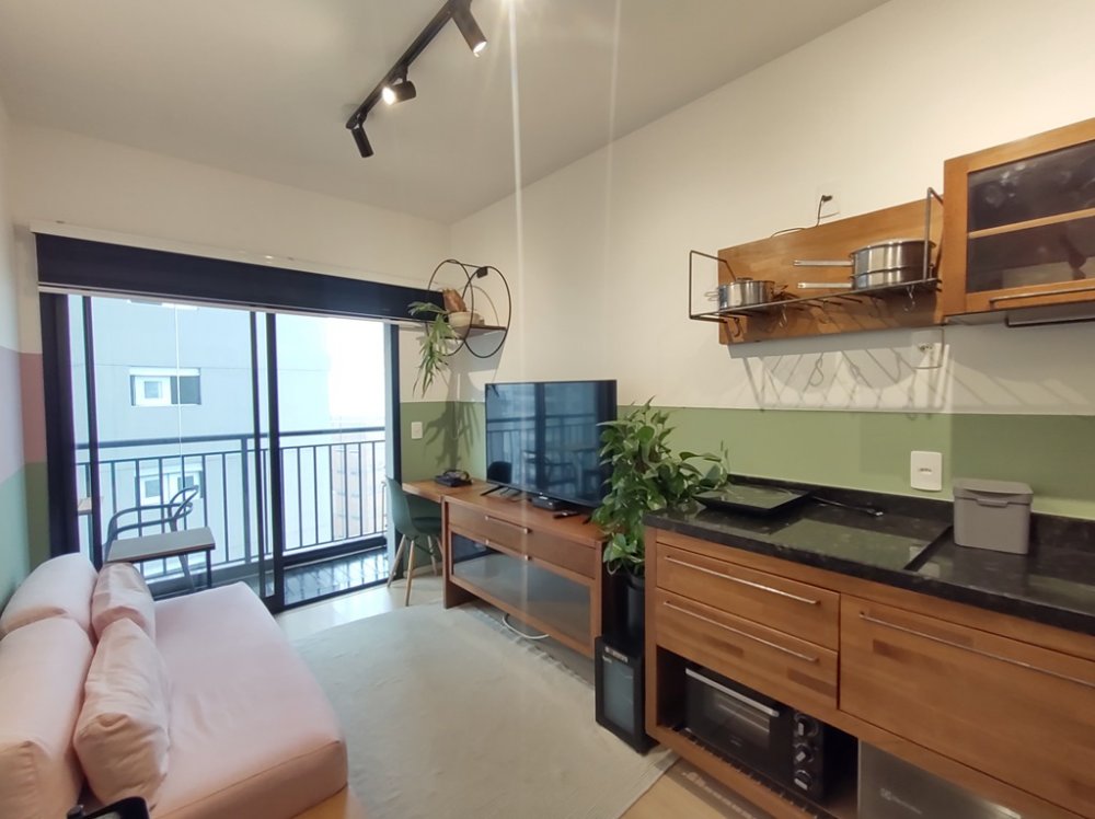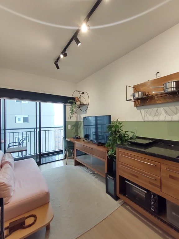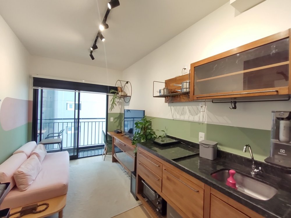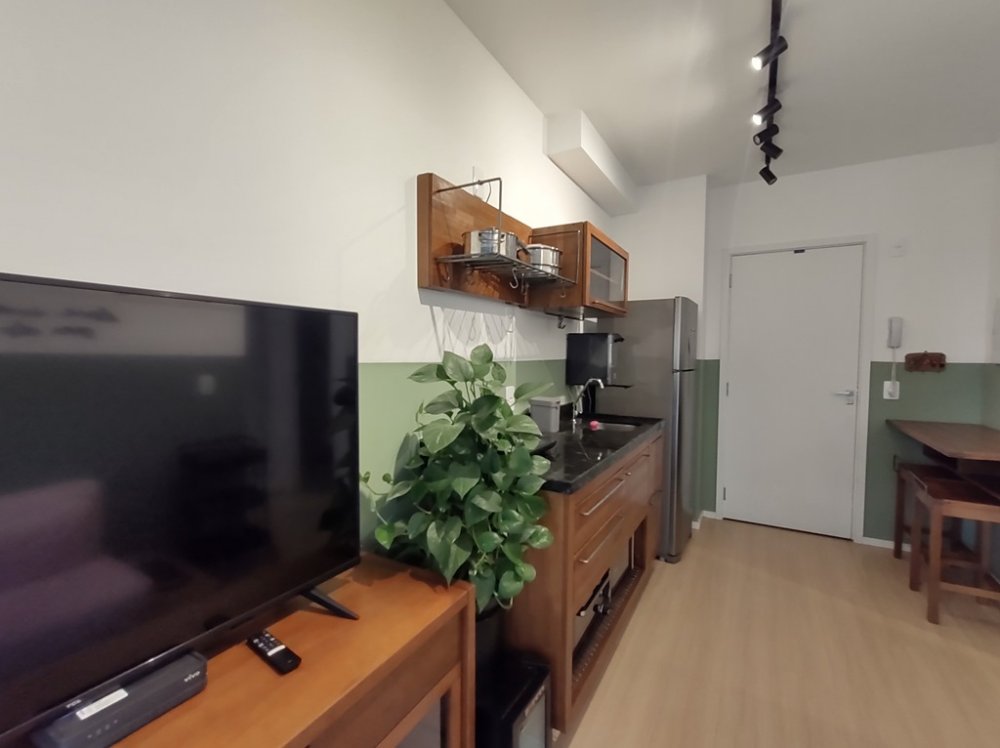 • Ambientes: Sala de estar, com varanda, integrada com a cozinha, proporcionando um ambiente aconchegante e funcional. Dormitório com varanda comunicando-se à sala, com ar-condicionado. Banheiro com chuveiro elétrico, box e armário.