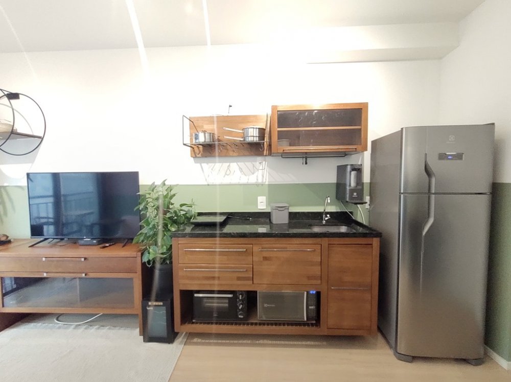 • Mobiliário: dormitório, banheiro e cozinha com armários Tok&Stok de muito bom gosto, bancada para refeições com banquetas. Cozinha equipada com geladeira, fogão de indução, forno elétrico e forno micro-ondas. Sala toda mobiliada, com TV, e uma decoração que vai fazer você se sentir em casa!
