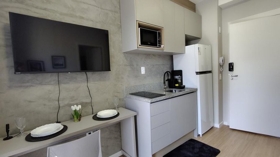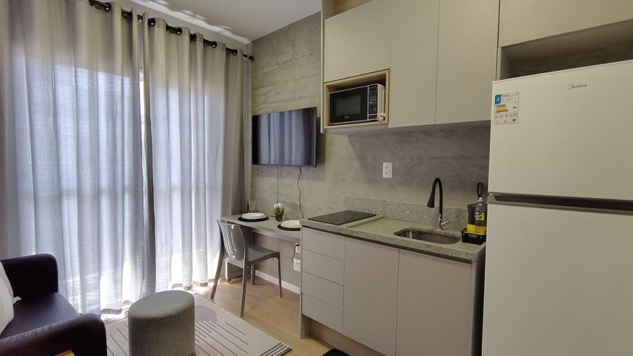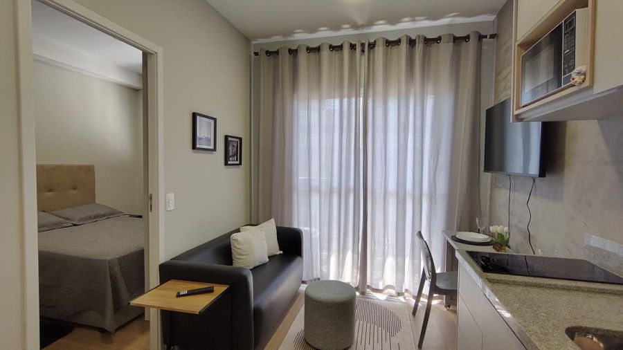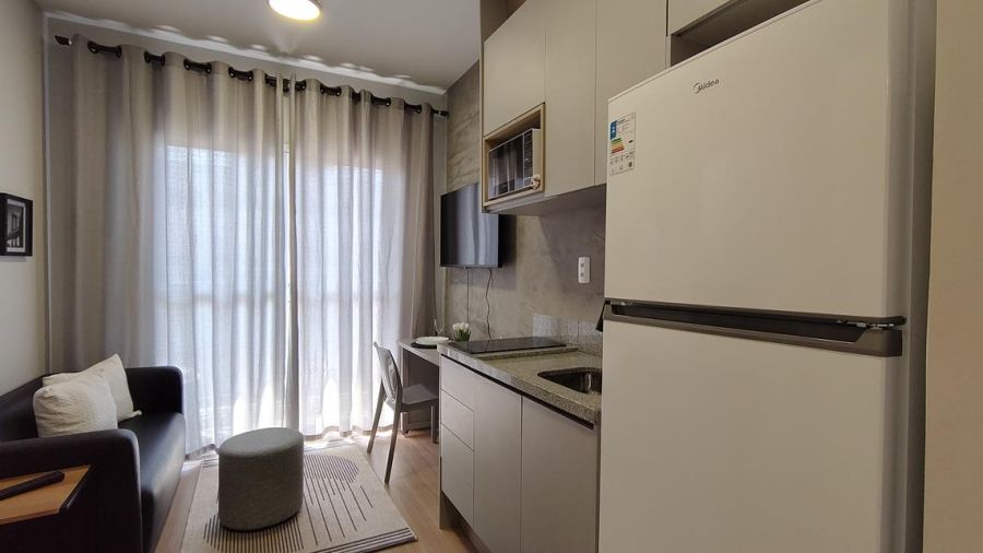 Este apartamento de 1 dormitório oferece tudo o que você precisa para viver com conforto: o ar condicionado no dormitório, proporciona o clima perfeito em todas as estações do ano, uma sala convidativa, um banheiro moderno e uma sacada charmosa para relaxar e apreciar a vista. A cozinha, já equipada com fogão, geladeira, freezer e micro-ondas, facilita o seu dia a dia. Utensílios de cozinha também estão inclusos, prontos para você preparar suas refeições favoritas!